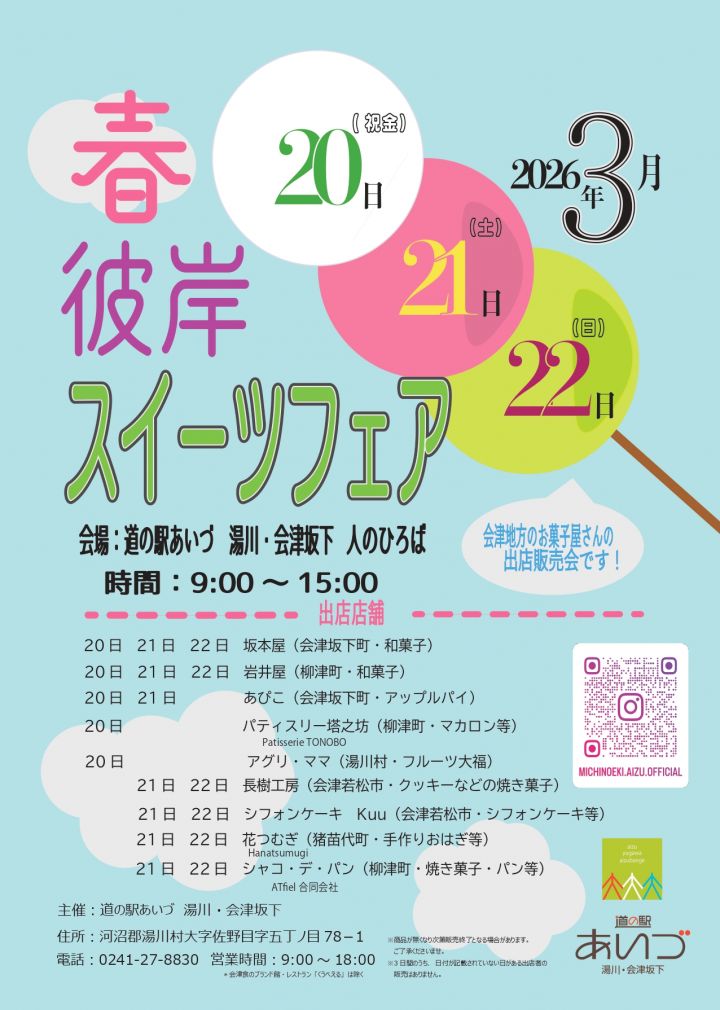 3月の三連休は、「春彼岸スイーツフェア」を開催します。会津地方で活躍しているお菓子屋さんが、自慢のスイーツを持って対面販売します。出店するお店と日付は、チラシをご覧ください。お店によっては、出店しない日もありますので、お気を付けください。(敬称・順不同)