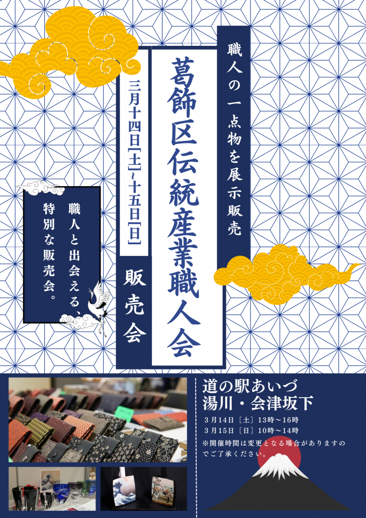 湯川村と「災害時総合応援協定」を締結している東京都葛飾区の【葛飾区伝統産業職人会】の方々の販売会が開催されます。素敵な工芸品、新生活を始めませんか?ぜひおこしください。