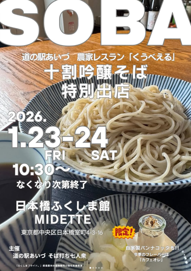 なんと!道の駅あいづで営業中の「れすとらんくうべえる」のお蕎麦が東京にある「日本橋ふくしま館 MIDETTE」で食べられるイベントが開催されます。これは行くっきゃないですね。お近くに来られた際は、ぜひご利用ください。※道の駅あいづ「れすとらんくうべえる」は期間中営業中です。 会津にいる方は、湯川村道の駅あいづをご利用ください。